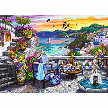 Settle in for a satisfying snack and a spectacular “Santorini Sunset”! After a full day of sightseeing, it's time to relax with a glass of wine and some crusty bread dipped in olive oil, and marvel at the splendor of Santorini! The most famous of the Greek islands, its trademark steep cliffs were formed by a huge volcanic eruption around 1600 BCE, causing the center of the island to sink, leaving a huge caldera (or crater). But now, it's downtime. With a gorgeous tangerine sky and lots of feathered friends for company, it's a traveler's (and puzzler's) paradise! This 300-piece Large Format jigsaw puzzle combines easy-to-handle, clean-cut pieces and Ravensburger's perfect interlocking fit for a most pleasurable puzzling experience! With pieces 30% larger than standard, details are easy to see, so you can complete it in just an evening or two. Create memorable moments with Ravensburger premium puzzles! About the Artist: Nancy Wernersbach's art career began at an early age, thanks to her parents' gift of 128 Crayola crayons! Her love for painting and capturing nature's beauty was nurtured at Southampton College, NY, where she earned her BFA. Nancy's watercolors & oils have won awards in national and regional juried art exhibits. Happy, refreshing, uplifting, and “windows to the outdoors” are words collectors use to describe her work. Now, Nancy brings the same love of nature and adds an element of fun and whimsy to her digital images.